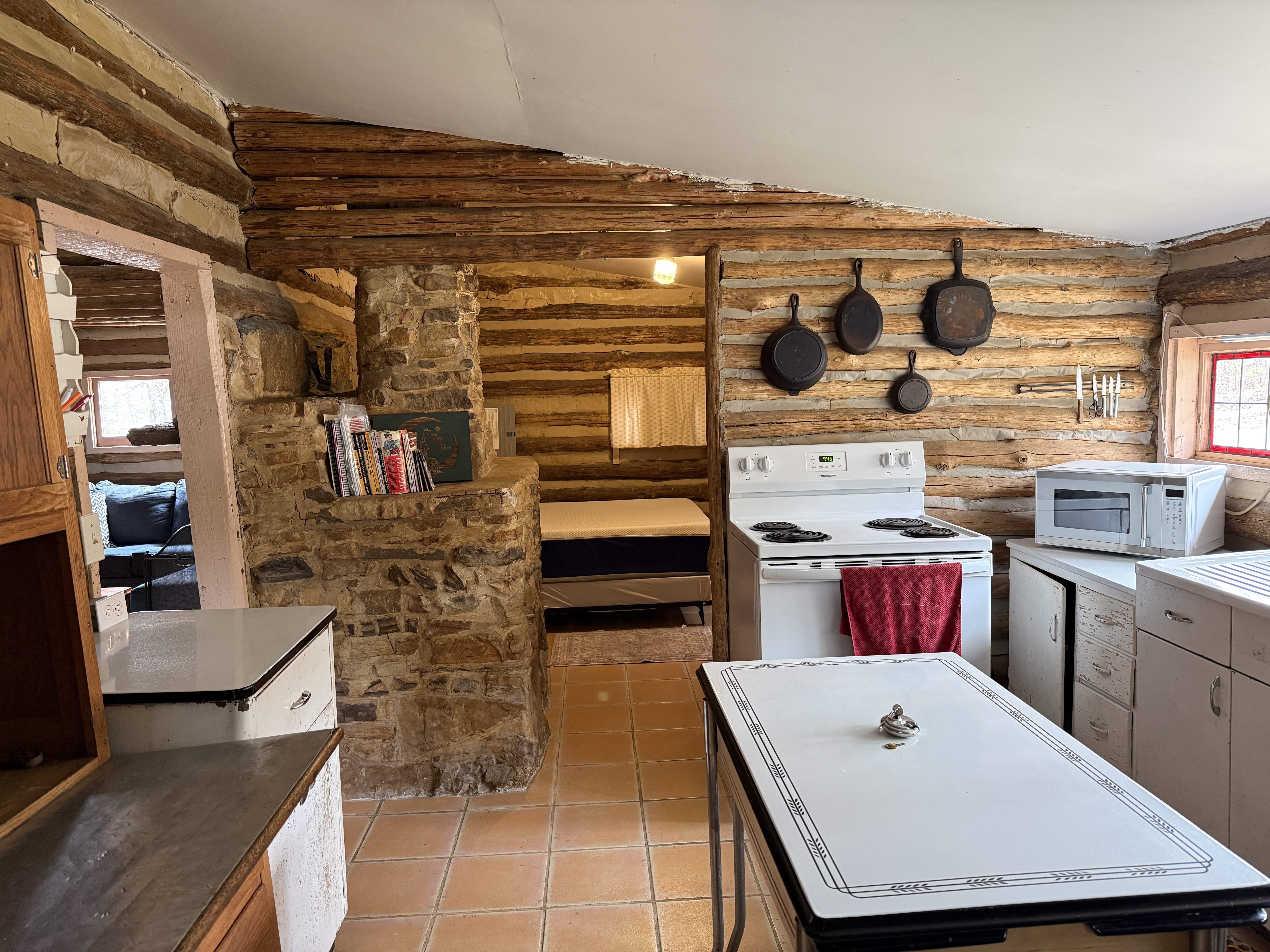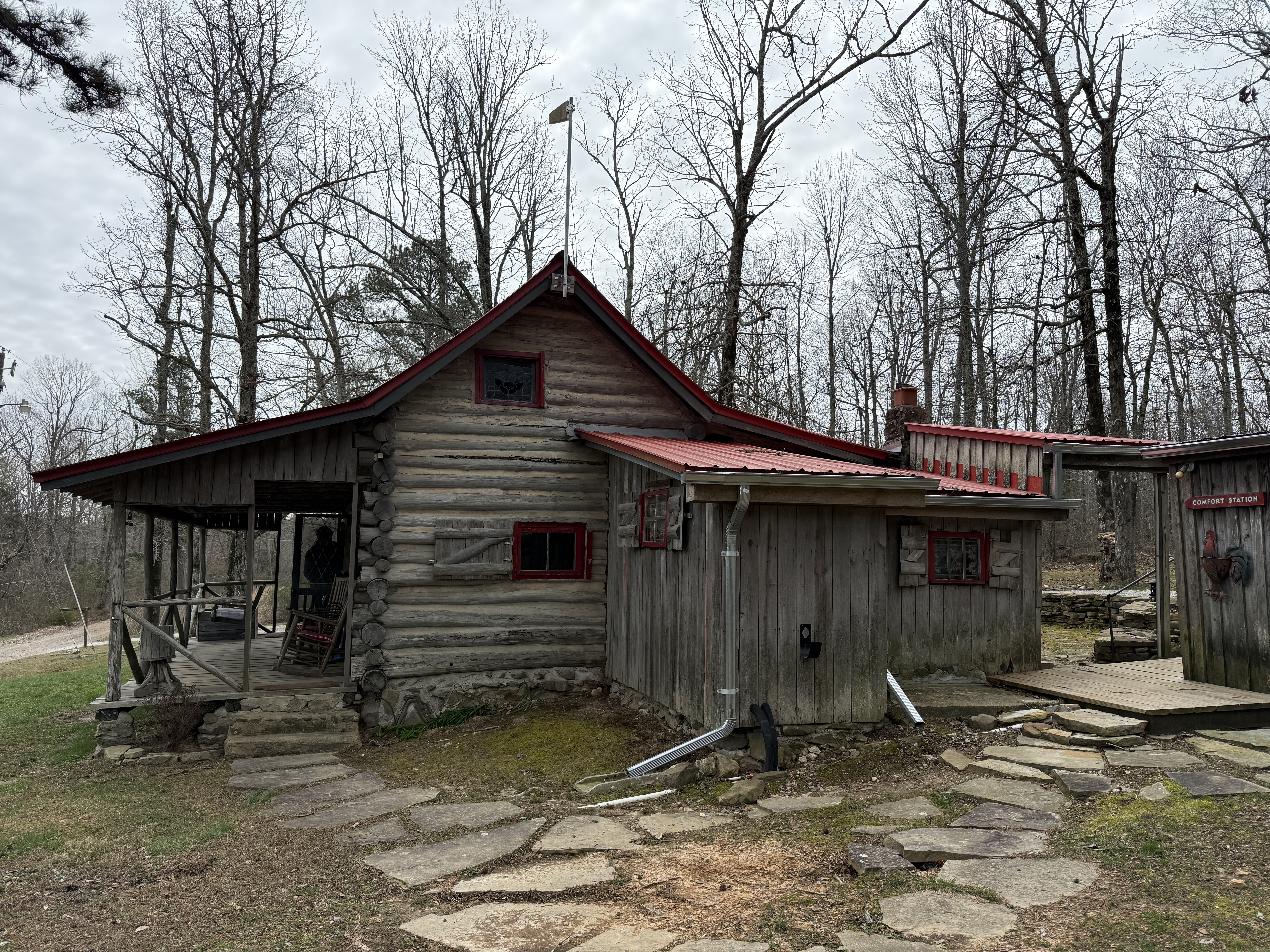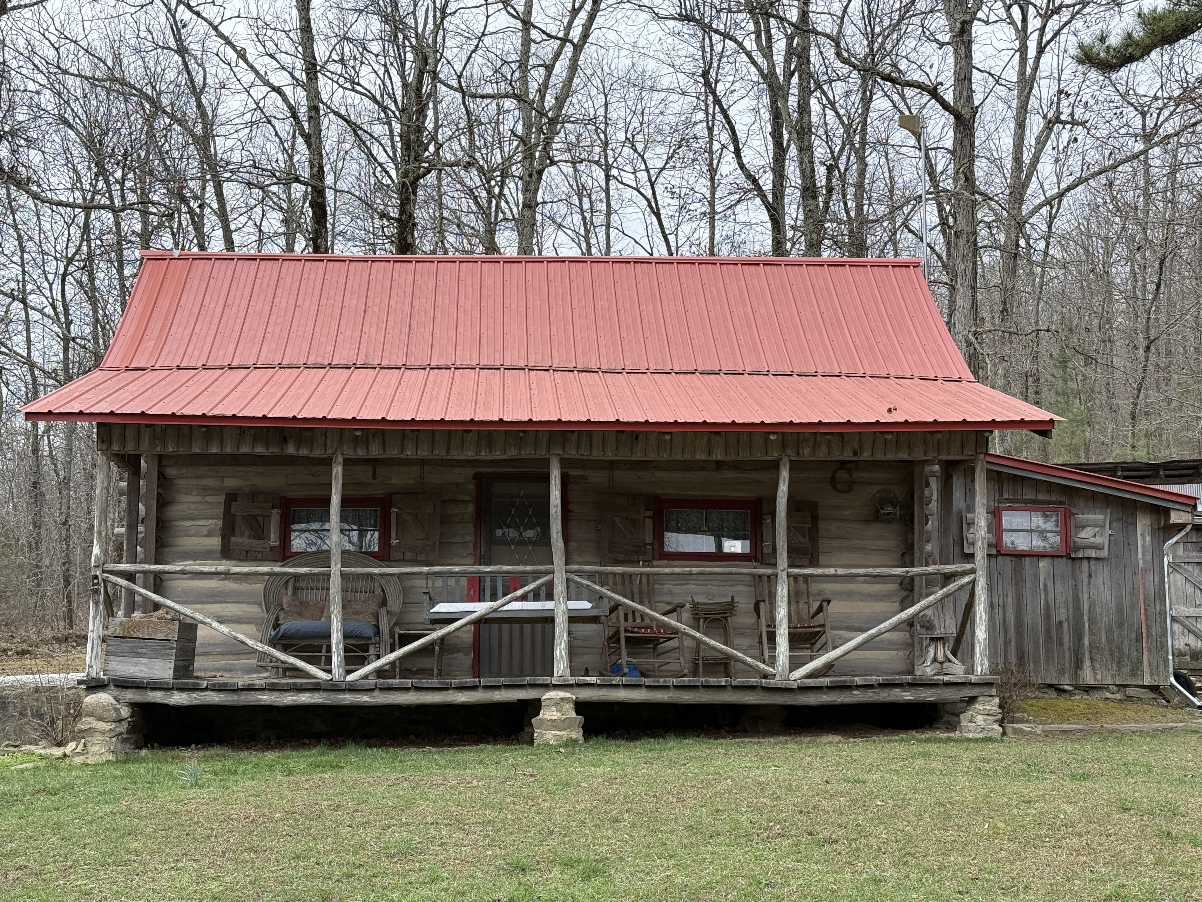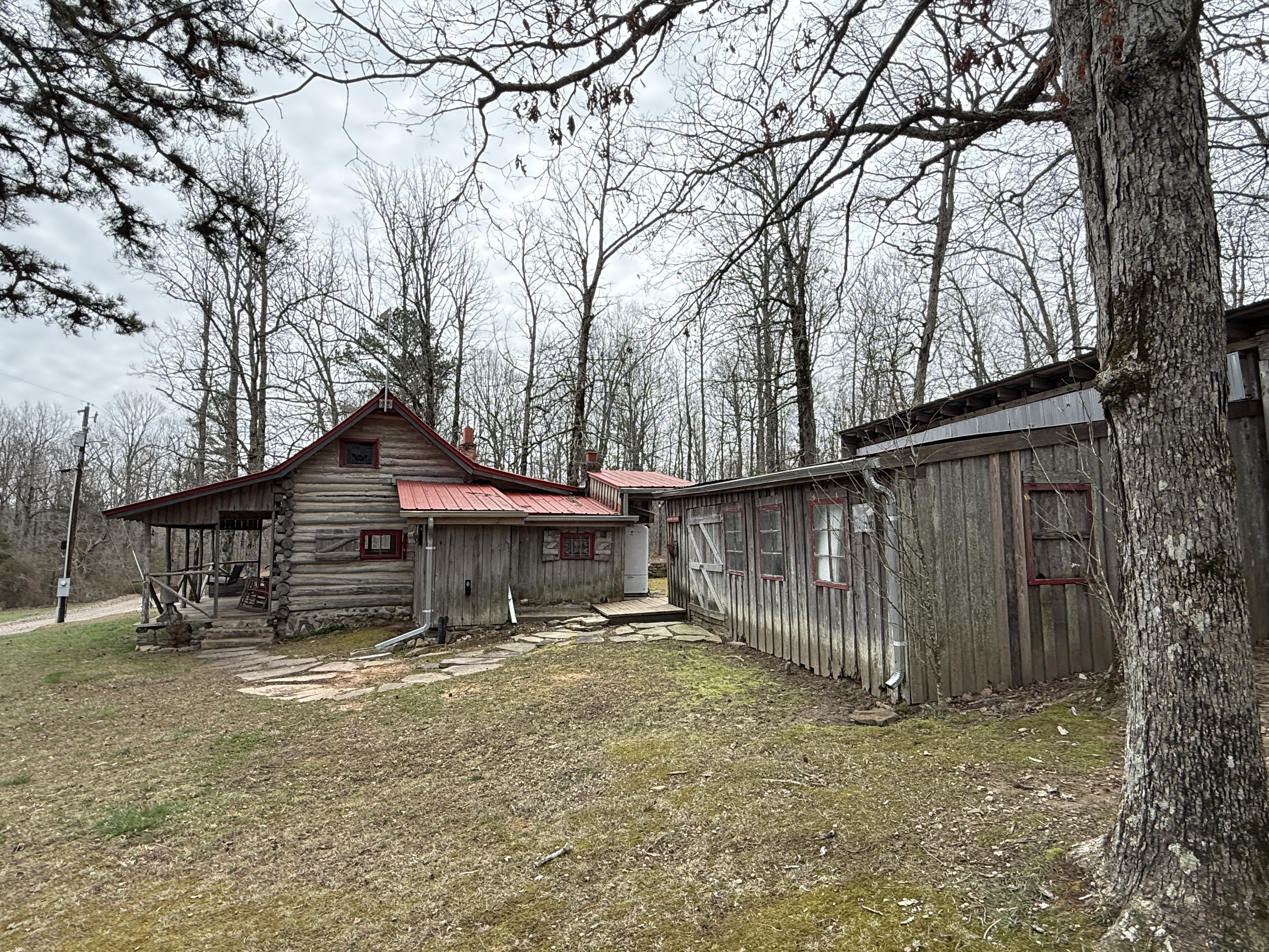 The main residence is a 667 +/- square foot log cabin featuring a stunning rock fireplace designed to radiate heat throughout the home, keeping you cozy on cool Ozarks evenings. The cabin offers a spacious living area, full kitchen, one bedroom just off the kitchen, and a full bath with a custom rock shower. A walkway connects the home to the laundry area, wood room, and carport—adding both convenience and functionality. The property is equipped with public water, electricity, and high-speed fiber internet, along with a backup well with hand pump located behind the cabin.