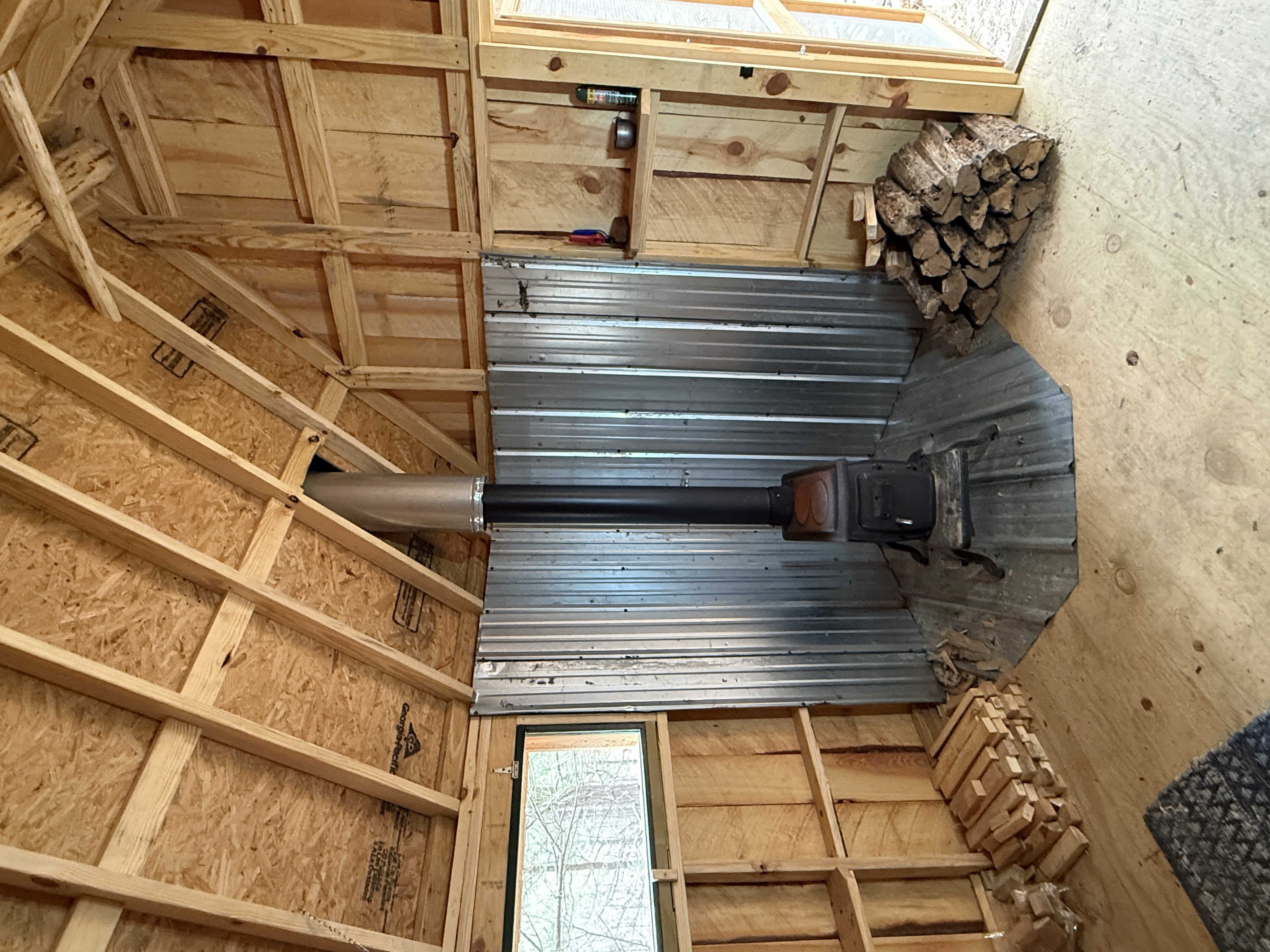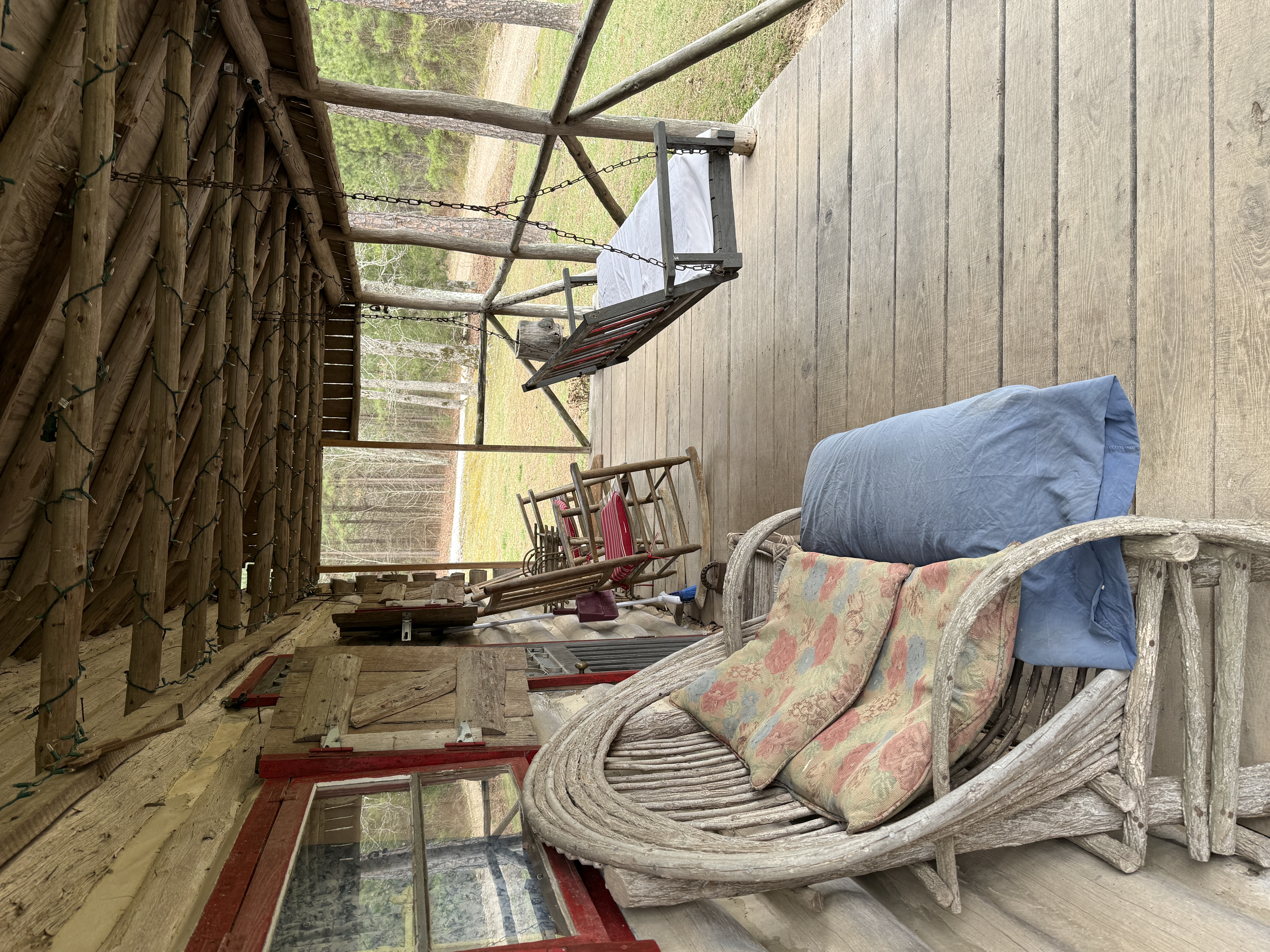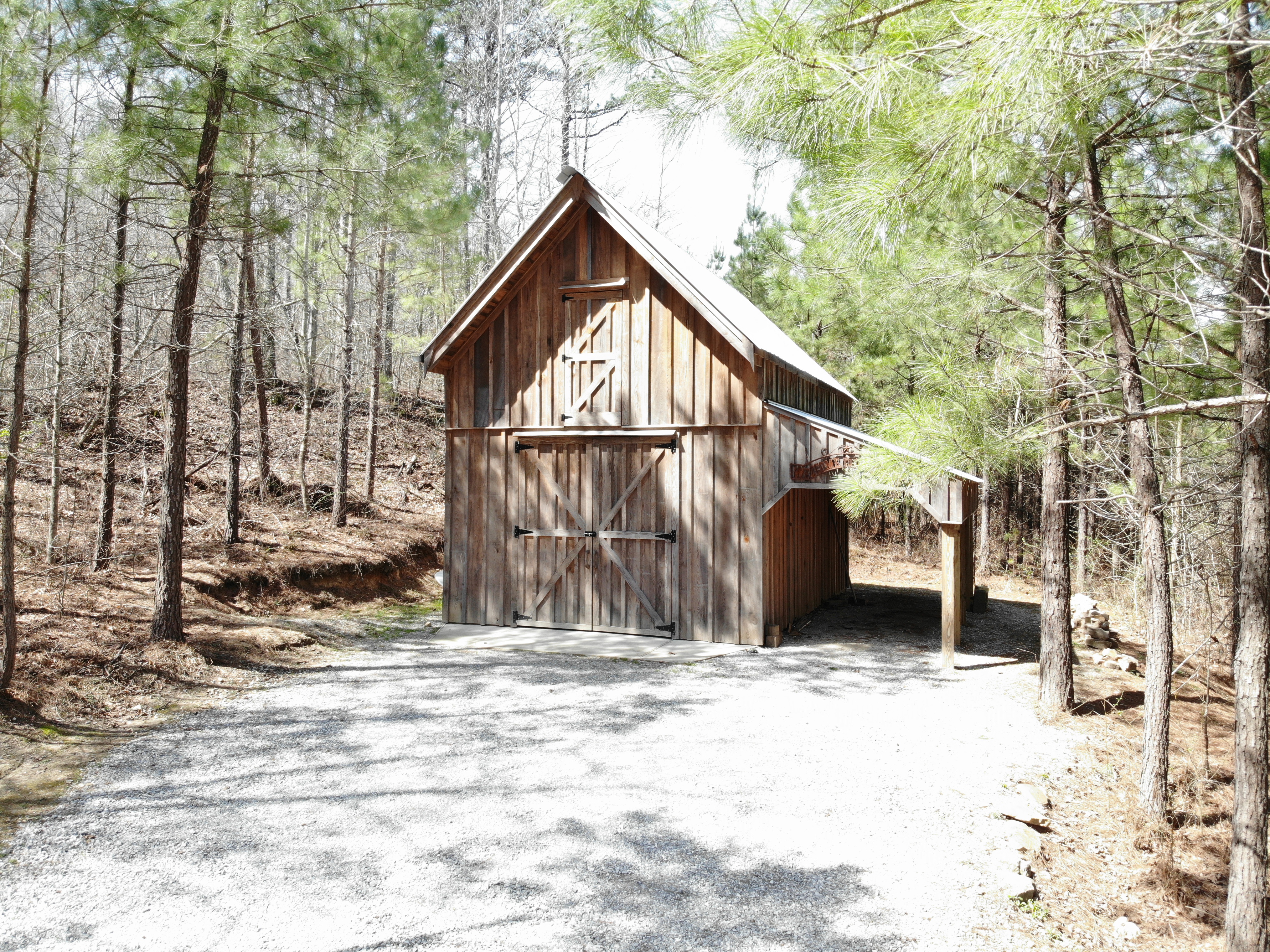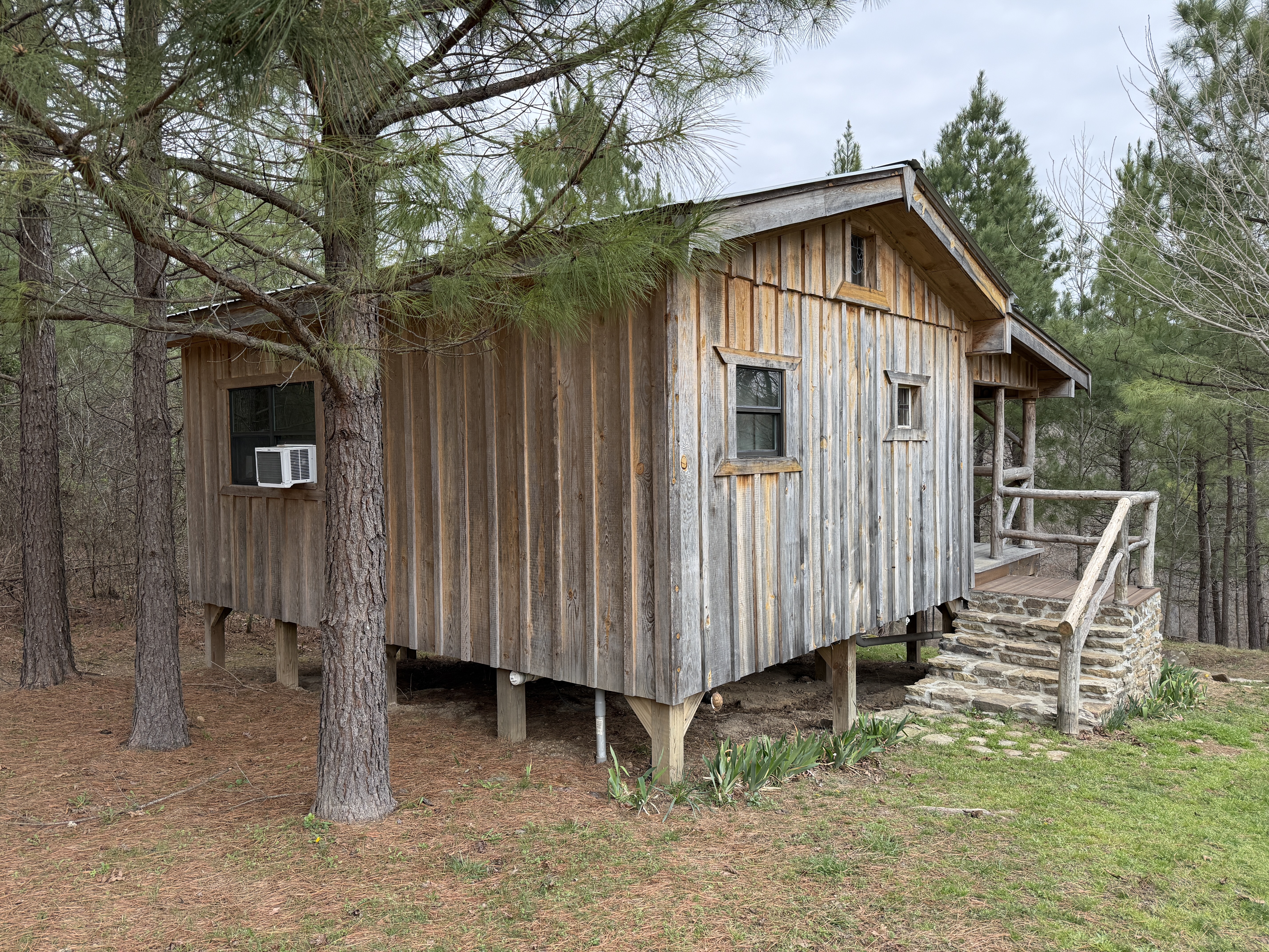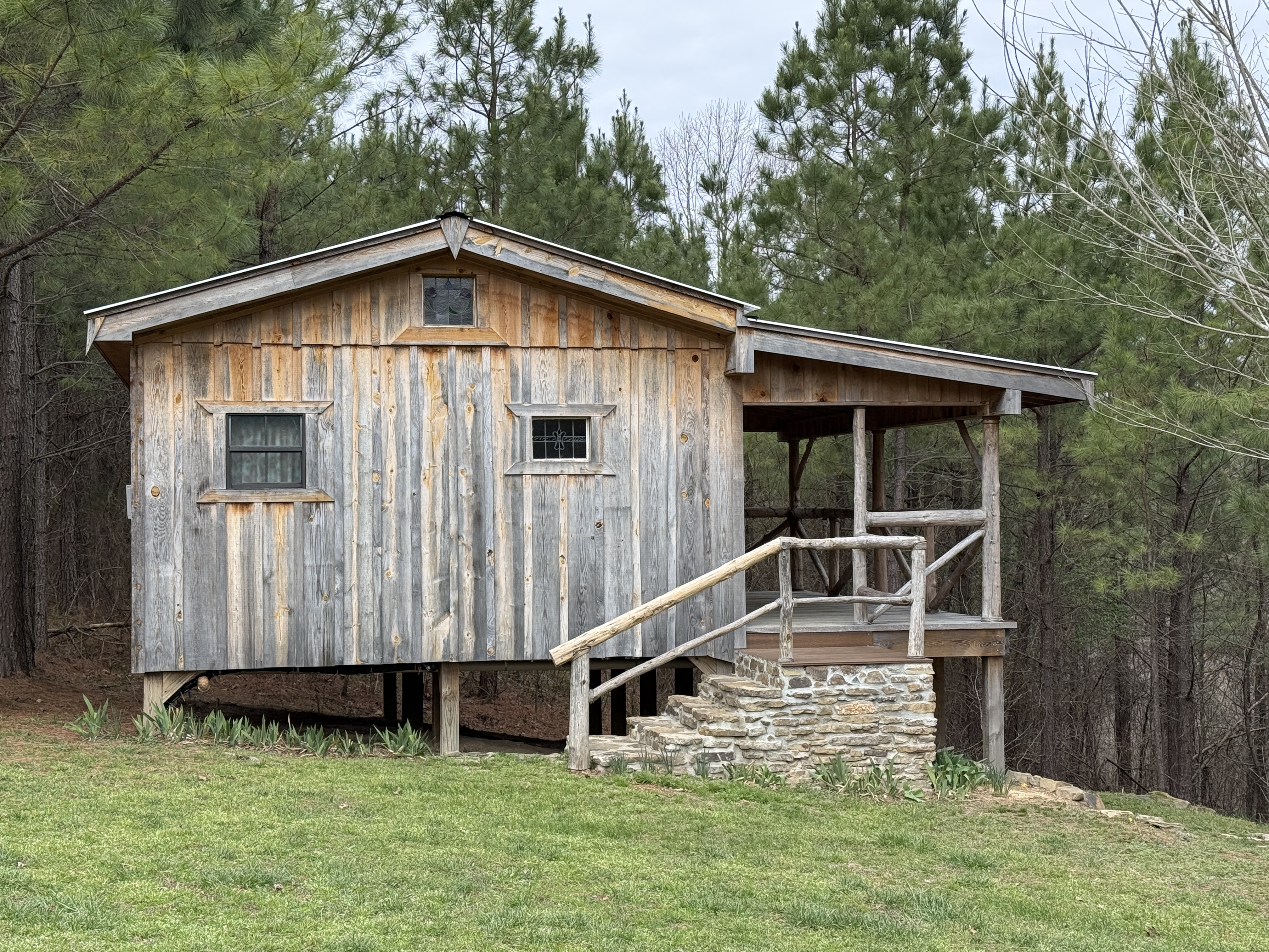 Guests and rental potential abound with multiple unique cabins. The “Studio Cottage” features a covered front porch, efficiency kitchen, refrigerator, and a beautifully finished full bath. Just down the hill, the “Lean-to Cabin” sits along the banks of Hurricane Creek with a covered porch and screened sleeping area—ideal for relaxing to the sound of flowing water. Across the creek, the “Dry Cabin” offers a quiet retreat complete with a wood stove, bed, and writing desk.